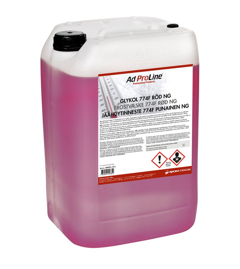 AdProLine® Jäähdytinneste 774F Punainen NG on moderni, korkealaatuinenpitkäikäinen jäähdytinneste. Se on kehitetty vastaamaan johtavien ajoneuvo- jamoottorivalmistajien asettamia entistä korkeampia vaatimuksia. Erityisesti suunniteltukäytettäväksi nykyaikaisissa polttomoottoreissa, hybridiautoissa ja epäsuorissa jääh-dytysjärjestelmissä sähköautoissa. Suojaa korroosiolta, jäätymiseltä, kiehumiselta jaestää kavitointia. AdProLine® Jäähdytinneste 774F Punainen NG on yhteensopivauseimpien muiden etyleeniglykoliin perustuvien jäähdytinnesteiden kanssa.