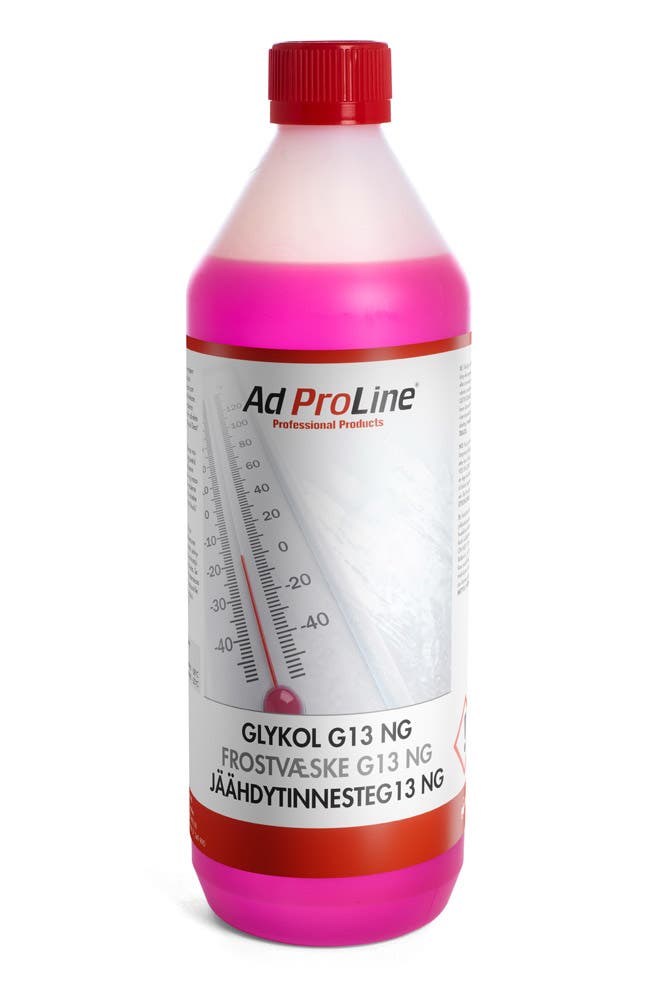 AdProLine® Jäähdytinneste G13 NG koostuu monoetyyleeniglykolista ja uudesta OAT- ja silikaattipohjaisesta inhibiittoripaketista, joka tarjoaa erinomaisen korroosiosuojan useimmille metalleille, mukaan lukien alumiinin. Se ei sisällä2-EHA:ta, amiineja, booraatteja tai nitriittejä. Tarkista jäähdytinnesteen pakka-senesto joka syksy ja täytä tarvittaessa. Etyyleeniglykoli on myrkyllistä eikä sitä saa nauttia. Se on biologisesti hajoava, ja pienen määrän päästöt eivät häiritse jätevedenpuhdistamoiden hajoamisprosesseja.