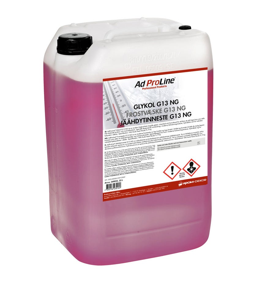 AdProLine® Jäähdytinneste G13 NG koostuu monoetyyleeniglykolista ja uudesta OAT- ja silikaattipohjaisesta inhibiittoripaketista, joka tarjoaa erinomaisen korroosiosuojan useimmille metalleille, mukaan lukien alumiinin. Se ei sisällä2-EHA:ta, amiineja, booraatteja tai nitriittejä. Tarkista jäähdytinnesteen pakka-senesto joka syksy ja täytä tarvittaessa. Etyyleeniglykoli on myrkyllistä eikä sitä saa nauttia. Se on biologisesti hajoava, ja pienen määrän päästöt eivät häiritse jätevedenpuhdistamoiden hajoamisprosesseja.