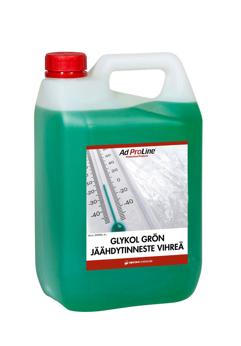 AdProLine® -jäähdytinneste vihreä perustuu monoetyylijäähdytinnesteeseen ja inhibiittoripakettiin ilman nitriittejä, amiineja ja fosfaatteja. Tarkista glykolinjäähdytyssuoja joka syksy ja täytä tarvittaessa. Etyleenijäähdytinneste on myrkyllinen eikä sitä saa nauttia. Se on biohajoava, ja pienet päästöt eivät häiritse puhdistuslaitoksen hajoamisvaiheita.