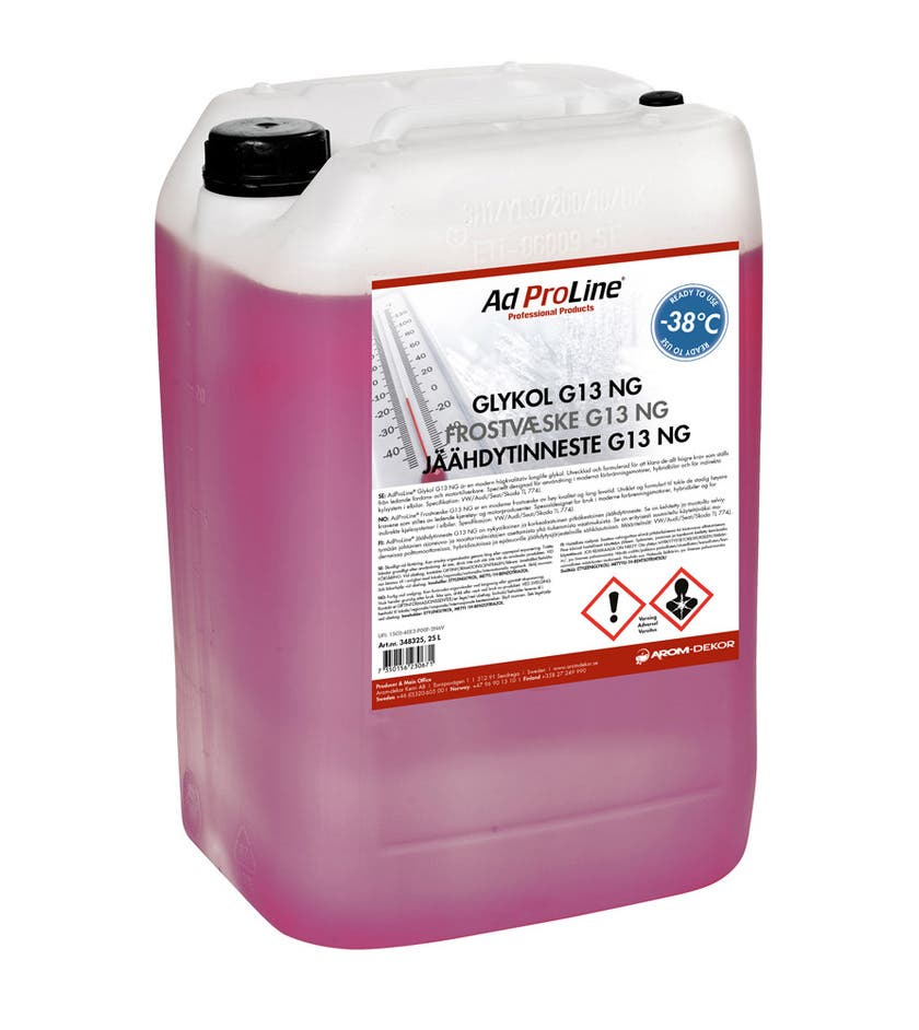 AdProLine® Jäähdytinneste G13 NG valmiiksi sekoitettu on moderni, laadukas pitkäikäinen jäähdytinneste. Se on kehitetty ja muotoiltu vastaamaan johtavien ajoneuvojen ja moottorivalmistajien asettamia yhä tiukempia vaatimuksia.Sitä on erityisesti suunniteltu käytettäväksi moderneissa polttomoottoreissa,hybridiautoissa ja sähköautojen kylmäjärjestelmissä. Se suojaa korroosiolta,jäätymiseltä, kiehumiselta ja estää kavitaation muodostumisen. AdProLine® Jäähdytinneste G13 NG Valmiiksi sekoitettu on yhteensopiva useimpien muiden etyleeniglykoliin perustuvien jäähdytinnesteiden kanssa.