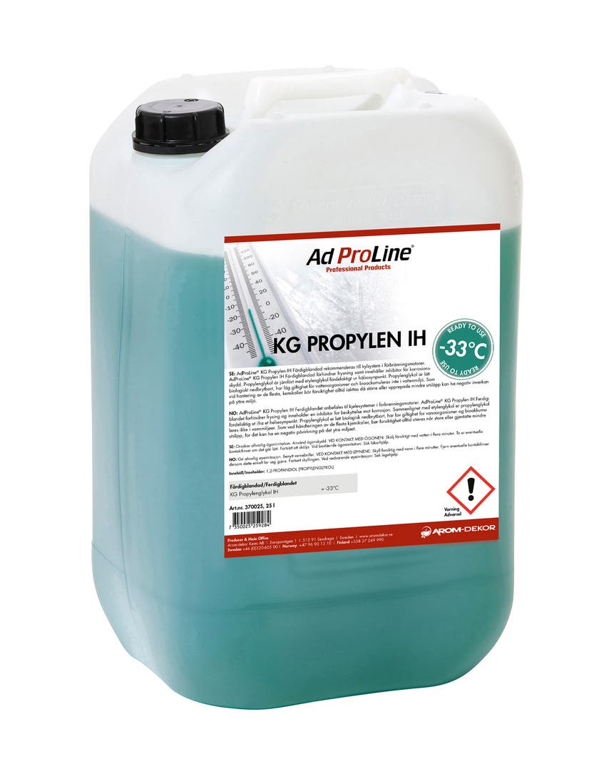 AdProLine® -KG Propyleenia IH suositellaan polttomoottoreille. Se estää moottorien jäätymisen ja sisältää inhibitaattoripaketin, joka suojaa korroosiolta kaikkia metalleja sekä alumiinia. KG Propyleeniglykoli perustuu 90 % kierrätettyyn propyleeniglykoliin.