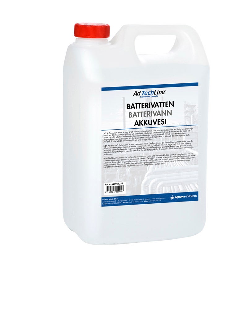 AdTechLine® akkuvesi on puhdasta deionisoitua vettä. Voidaan käyttää erilaisissa sovelluksissa, joissa puhtaalle vedelle asetetaan suuria vaatimuksia. Akut, auto- ja veneakkujen nestetason tulisi olla noin 5 mm akun levyjen yläpuolella. Tarkista akku säännöllisesti ja täytä se akkuvedellä. Höyrysilitysraudat, tavallisen vesijohtoveden käyttäminen höyrysilitysraudassa voi aiheuttaa sen tukkeutumisen kalkista. Käytä siksi aina akkuvettä ongelmien välttämiseksi.