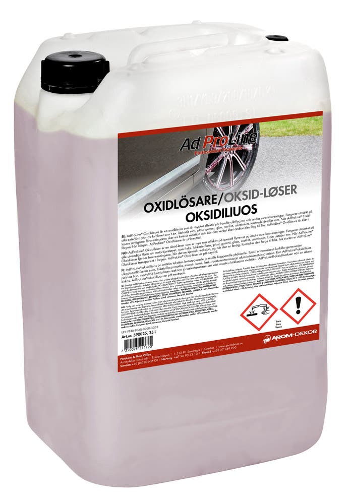 AdProLine® oksidiliuos on erittäin tehokas ennen kaikkea lentoruosteen ja muiden happamien epäpuhtauksien puhdistukseen. Toimii erinomaisesti kaikilla ajoneuvon ulkopinnoilla, kuten maalatuilla pinnoilla, muovilla, kumilla, lasilla, ruostumattomalla teräksellä, alumiinilla, kromiosilla jne. AdProLine® oksidiliuos on pH-neutraali. AdProLine® oksidiliuos muuttaa väriä violetiksi, kun vaikutus valmis, joten sitä on erittäin helppo käyttää.