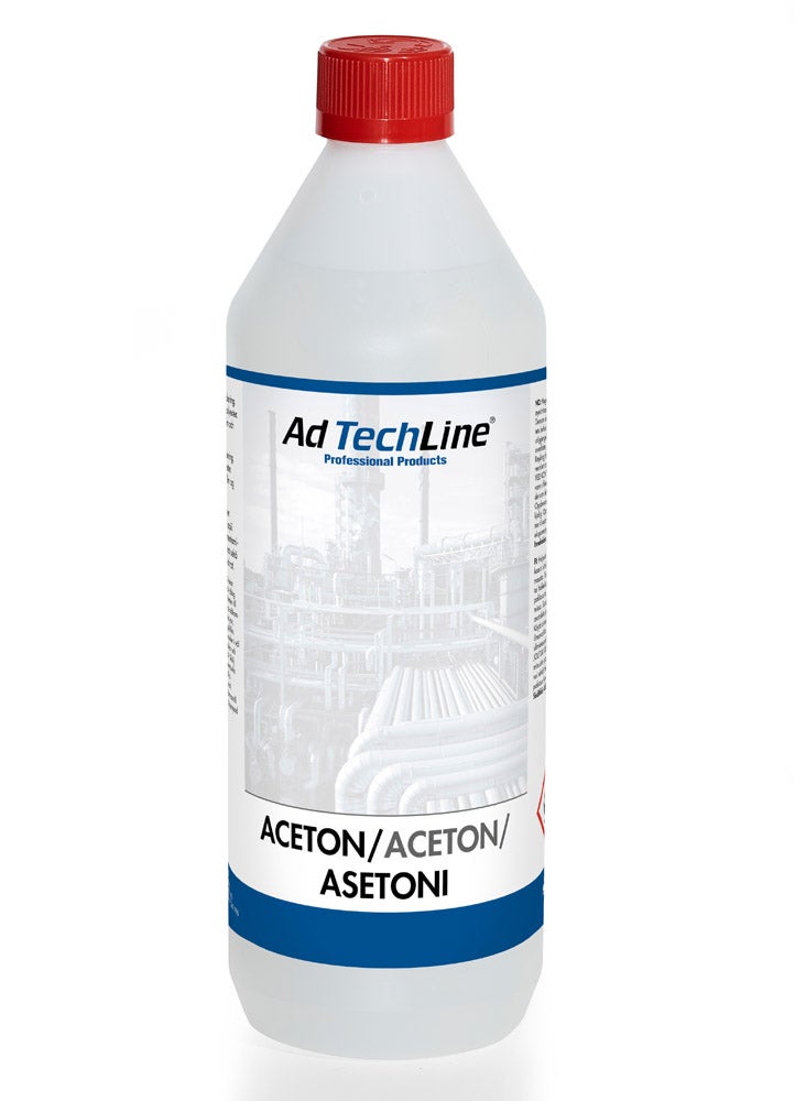 AdTechLine® Asetoni puhdistaa ja ohentaa polyesteriä sekä poistaa öljytuotteiden, liiman ja tarramerkkien aiheuttamia tahroja.