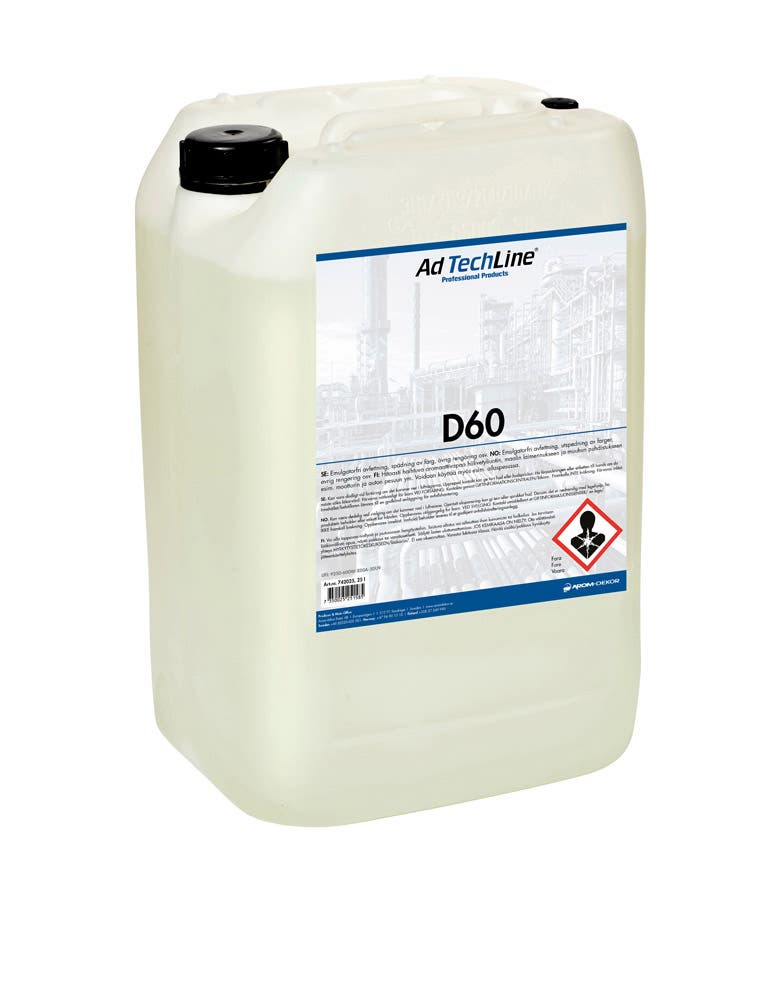 D60 – Emulgointiaineeton Rasvanpoistoaine D60 on kevyt ja tehokas rasvanpoistoaine. Emulgointiaineeton koostumus ei jätä jäämiä.